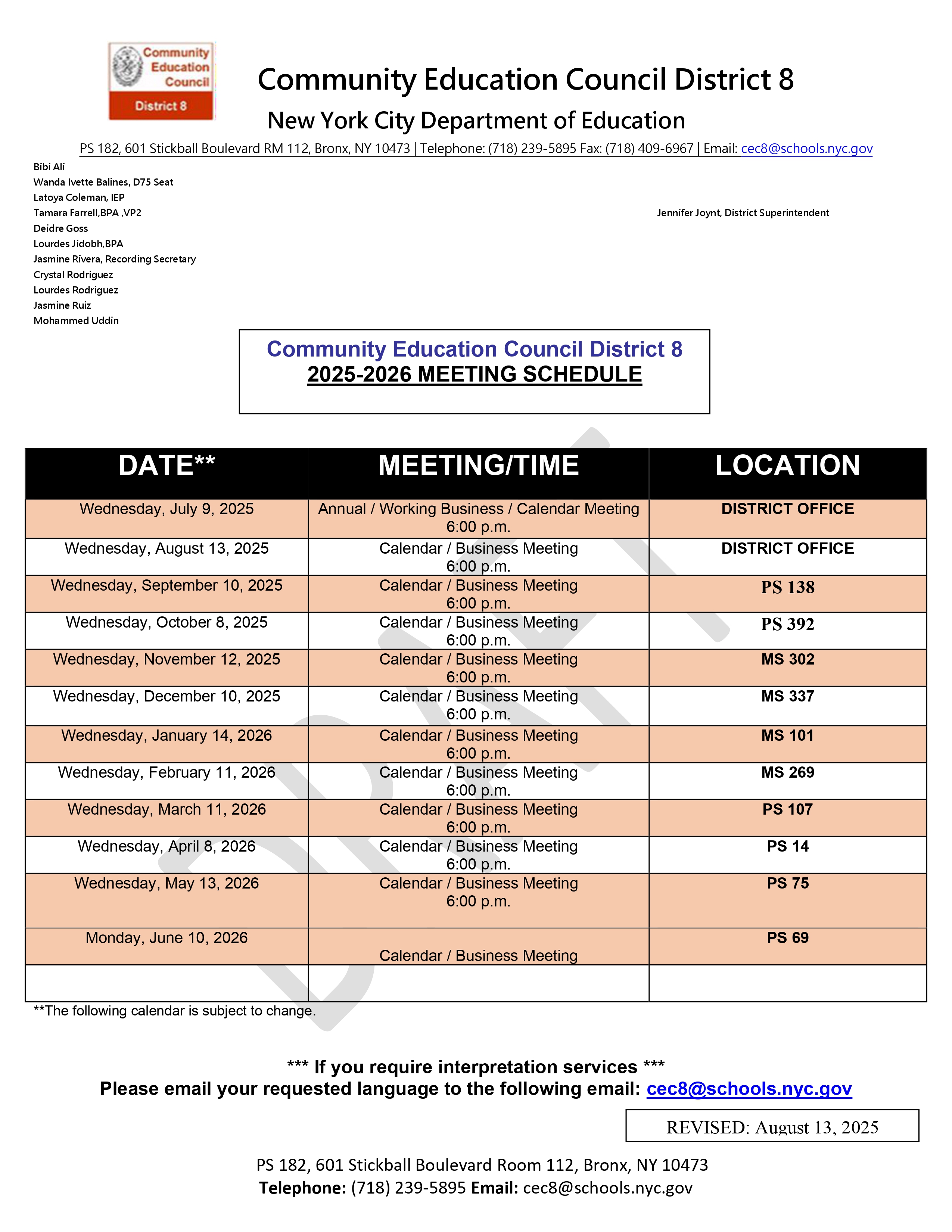 - Providing input in the hiring of superintendents and parent coordinators, and submitting a yearly evaluation of the superintendent.